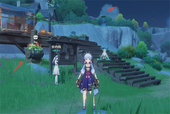 最后一个宝箱,也就是宝箱八,在晨曦酒庄南方(也就是地图下方)。会看到一个有烟囱的房子,宝箱就在房子侧面的空地上。同样来自不熟的NPC,有一个店铺装饰,以及两万摩拉两个矿。
