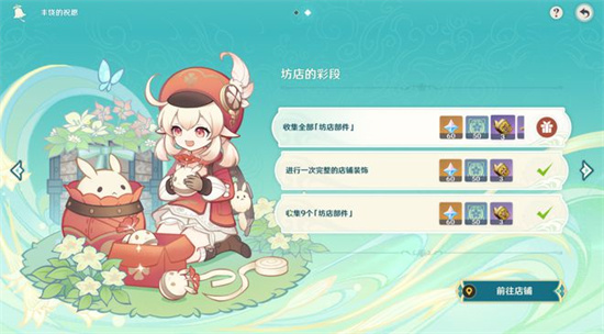 在找到所有三轮八个宝箱,也就是二十四个宝箱后,就可以去活动页面解锁来自可莉的奖励了。一共是3*60的原石。第三轮除了原石跟活动热度以及天赋书之外,还有两个店铺装饰。这时候玩家就可以去装饰清泉镇的店铺了。